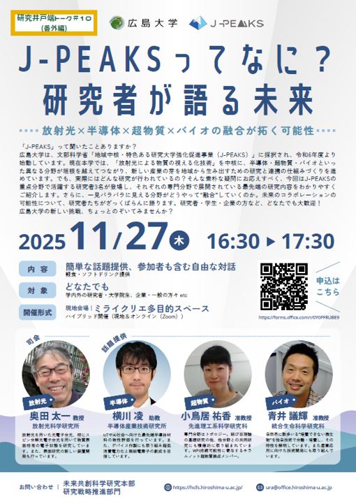 This time, the 10th Research Watering Hole Talk (Special Edition) is titled " What is J-PEAKS? Researchers Discuss the Future." Researchers active in the key areas of J-PEAKS —synchrotron radiation, semiconductors, metamaterials, and bio —will take the stage. They will candidly discuss the appeal of their respective research and the potential for interdisciplinary fusion research that transcends field boundaries.